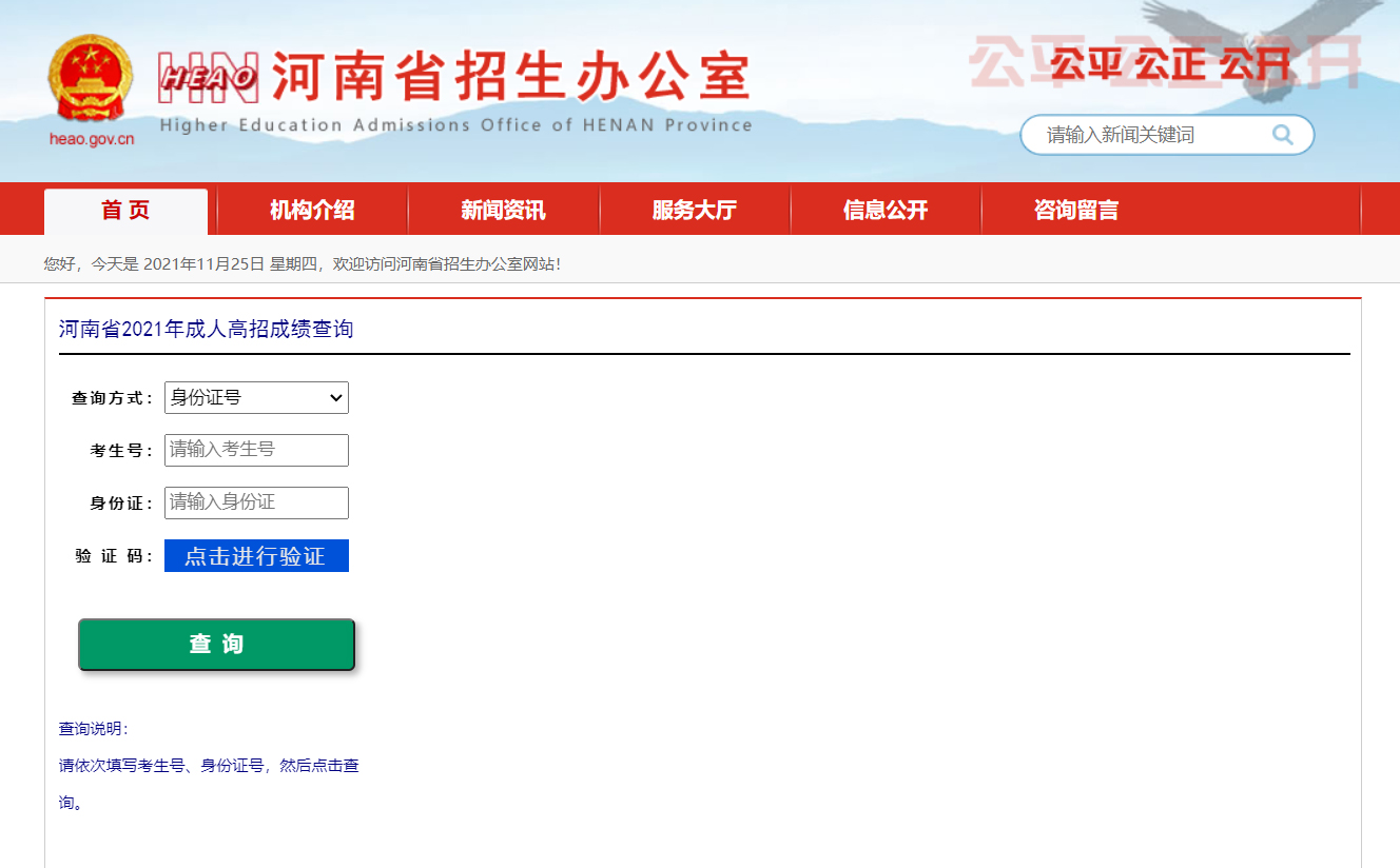 河南省2021年成人高招成绩查询