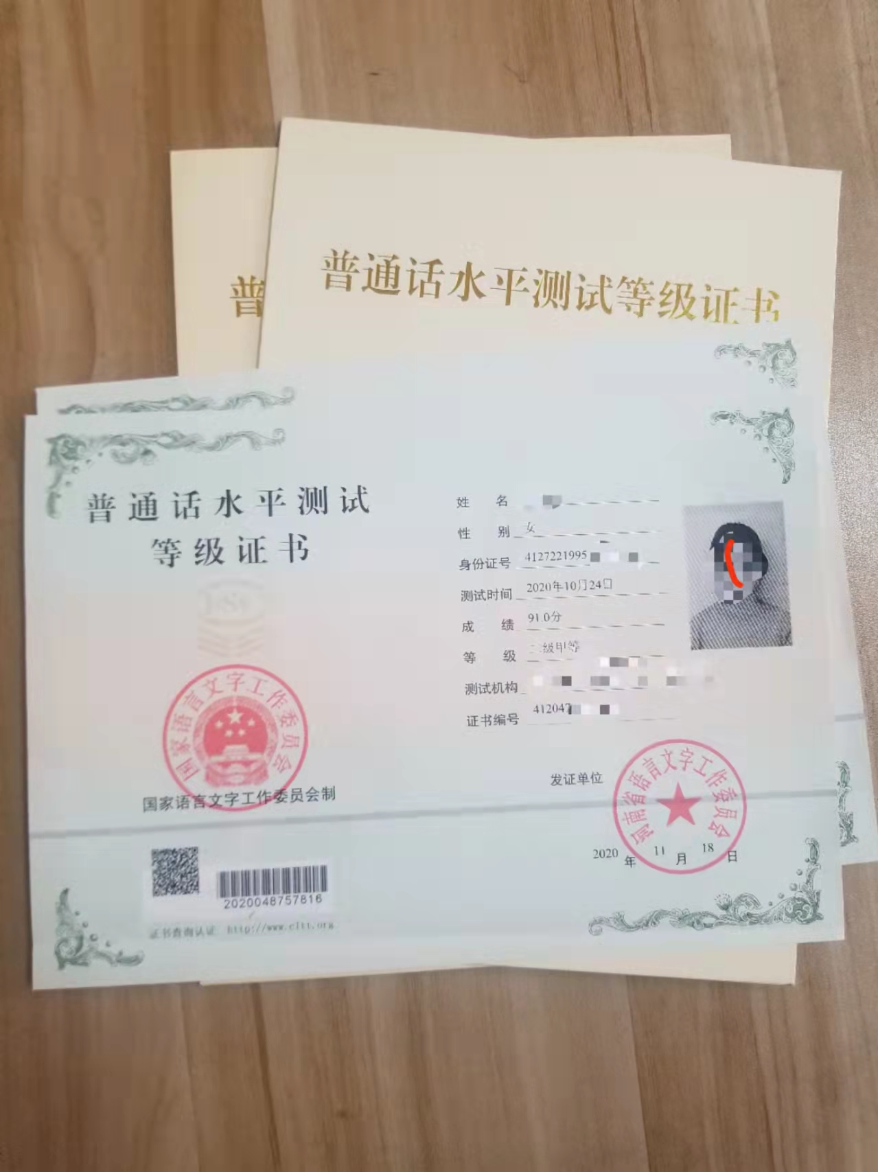 自2011年起,普通话证书样式进行了改版,旧版中包含出生年月,新版取消;旧版无身份证号码,新版增加;新版增加测试时间。均盖有国家语言文字工作委员会公章及测试中心的钢印。并由之前的本状改成纸状,且附有证书外壳。